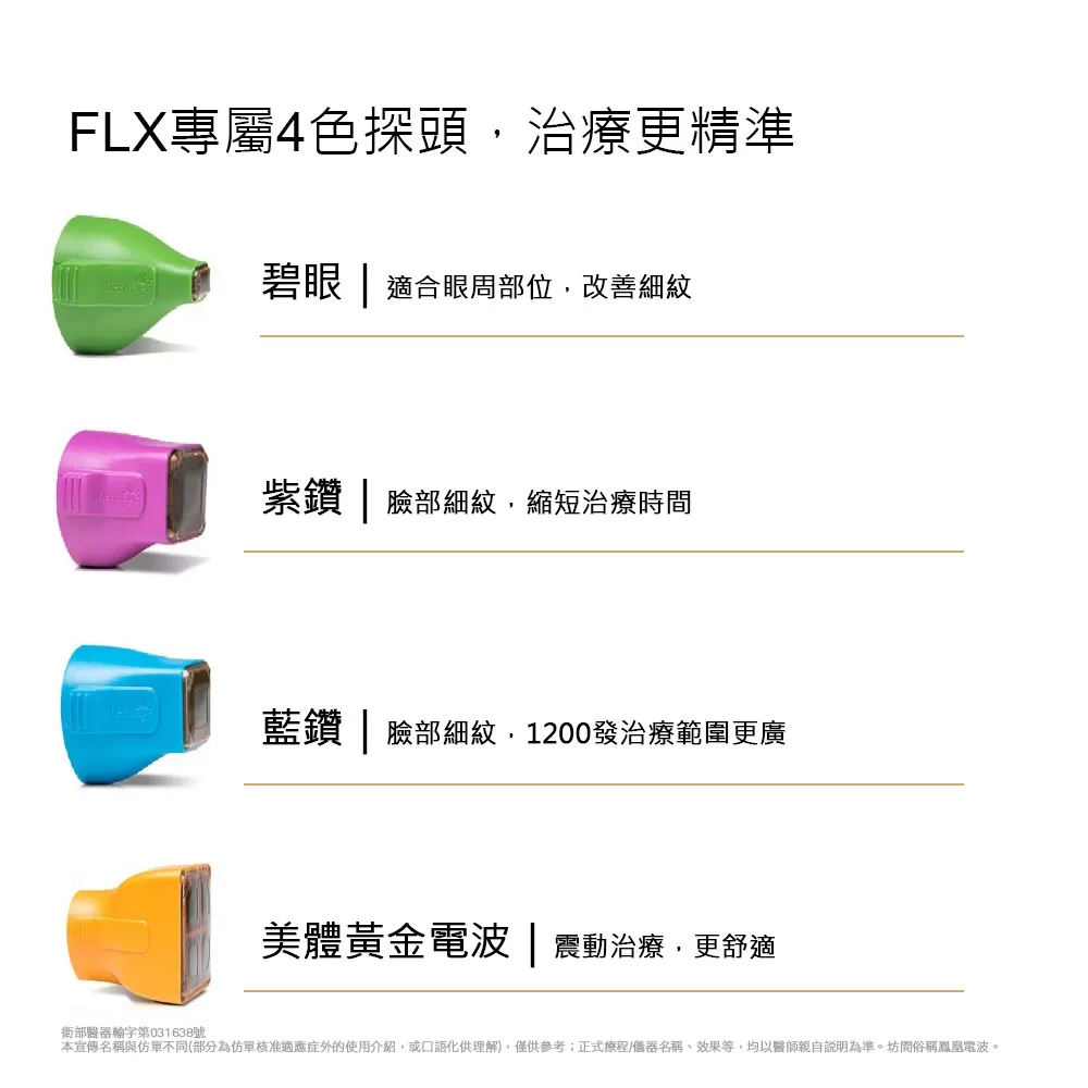 本宣傳名稱與仿單不同(部分為仿單核准適應症外的使用介紹,或口語化供理解),僅供參考;正式療程/儀器名稱、效果等,均以醫師親自說明為準。“梭達”熱世紀飛可適除皺系統 衛部醫器輸字第031638號/仿單含適應症禁忌症說明。Thermage FLX坊間俗稱鳳凰電波/第四代電波拉提/電波拉皮。
